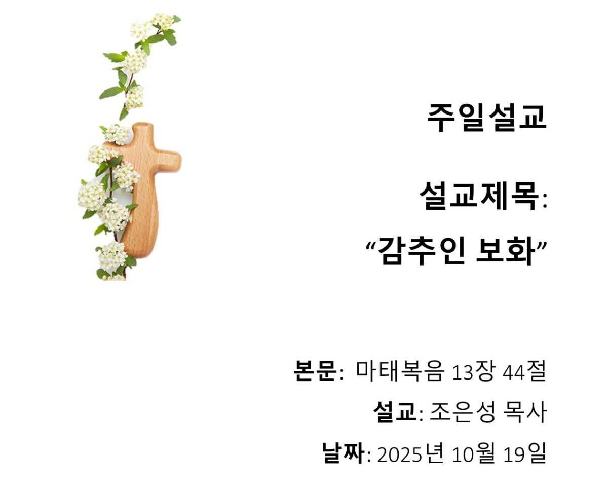 View Larger Image 감추인 보화 주일설교 말씀 동영상 /sermon_movie/101925_Sunday_1.mp4 주일설교 설교제목: 감추인 보화 설교: 조은성 담임목사 본문: 마태복음 13장 44절 날짜: 2025년 10월 19일 주일설교 말씀 듣기 MP3 /sermon_movie/101925_Sunday_1.mp3 Download Now 본문말씀 41 천국은 마치 밭에 감추인 보화와 같으니 사람이 이를 발견한 후 숨겨 두고 기뻐하며 돌아가서 자기의 소유를 다 팔아 그 밭을 사느니라 kupc2025-10-19T09:33:49-05:00 Related Posts 성령의 열매(8) – 온유 Gallery 성령의 열매(8) – 온유 성령의 열매(7) – 충성 Gallery 성령의 열매(7) – 충성 성령의 열매(6) – 양선(선함) Gallery 성령의 열매(6) – 양선(선함) 성령의 열매(5) – 자비(긍휼) Gallery 성령의 열매(5) – 자비(긍휼) 성령의 열매(4) – 오래참음 Gallery 성령의 열매(4) – 오래참음