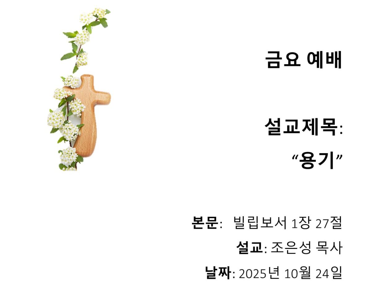 View Larger Image 용기 금요설교 말씀 동영상 /sermon_movie/102425_Friday.mp4 금요설교 설교제목: 용기 설교: 조은성 목사 본문: 빌립보서 1장 27절 날짜: 2025년 10월 24일 금요설교 말씀 듣기 MP3 /sermon_movie/102425_Friday.mp3 Download Now 본문말씀 27 오직 너희는 그리스도의 복음에 합당하게 생활하라 이는 내가 너희에게 가 보나 떠나 있으나 너희가 한마음으로 서서 한 뜻으로 복음의 신앙을 위하여 협력하는 것과 kupc2025-10-26T13:05:05-05:00 Related Posts 화목제 Gallery 화목제 소제 Gallery 소제 번제 Gallery 번제 심판을 면하는 복된 자 Gallery 심판을 면하는 복된 자 선을 행하는 삶 Gallery 선을 행하는 삶